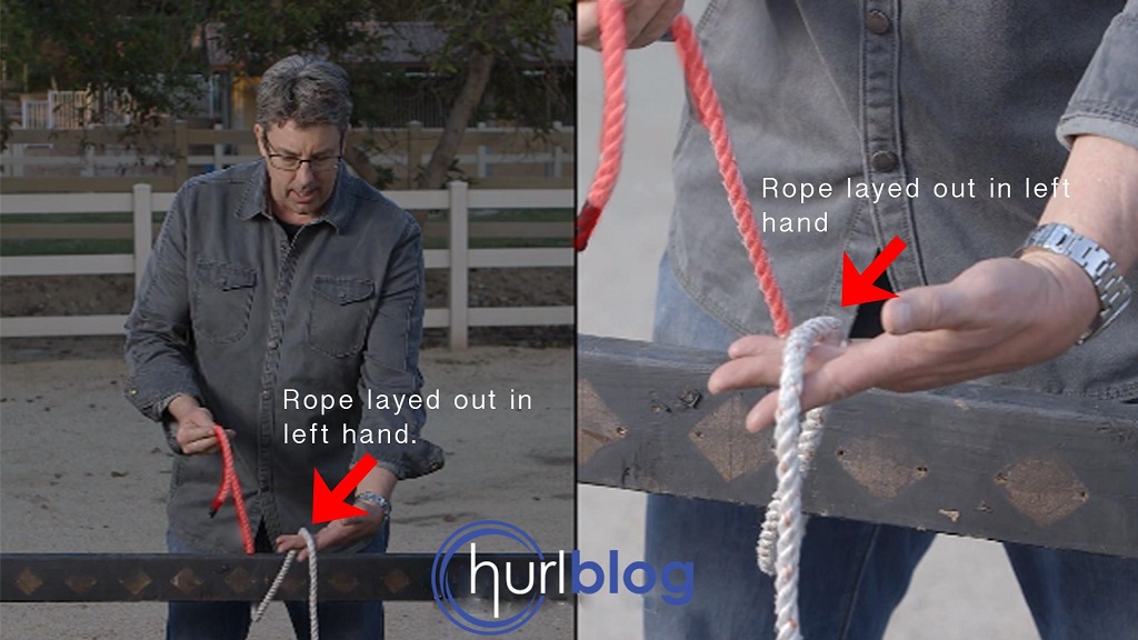 Lay one part of the rope in your left hand. The rope side in my right hand will be highlighted red.