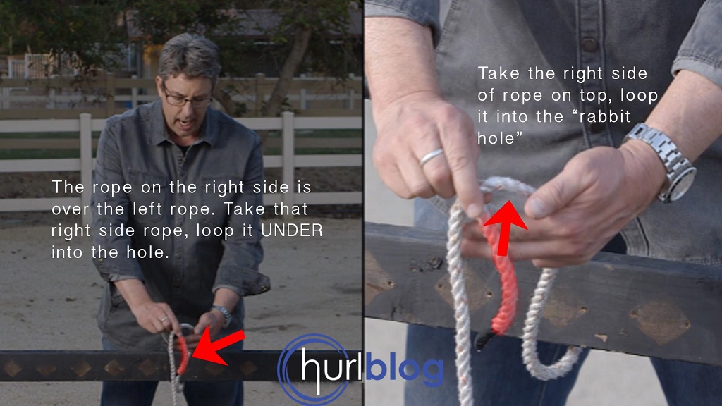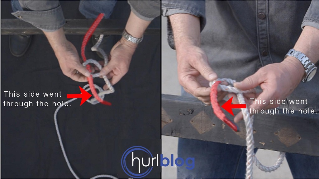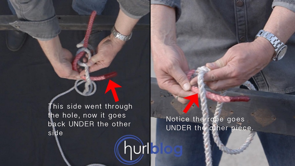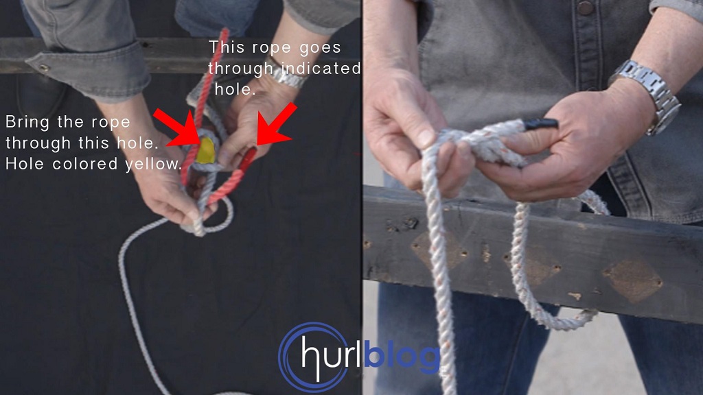 The rope highlighted red indicates the right rope side, which goes over the left rope side and comes up through the hole.